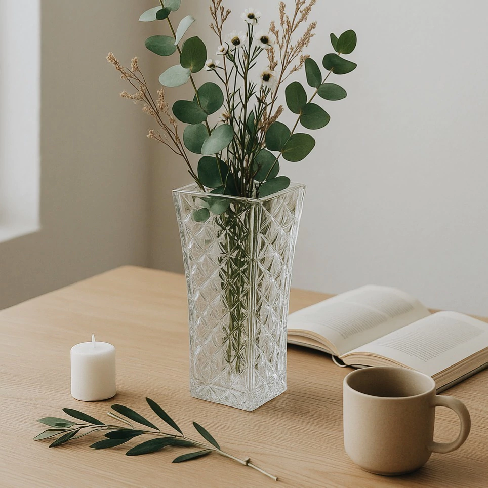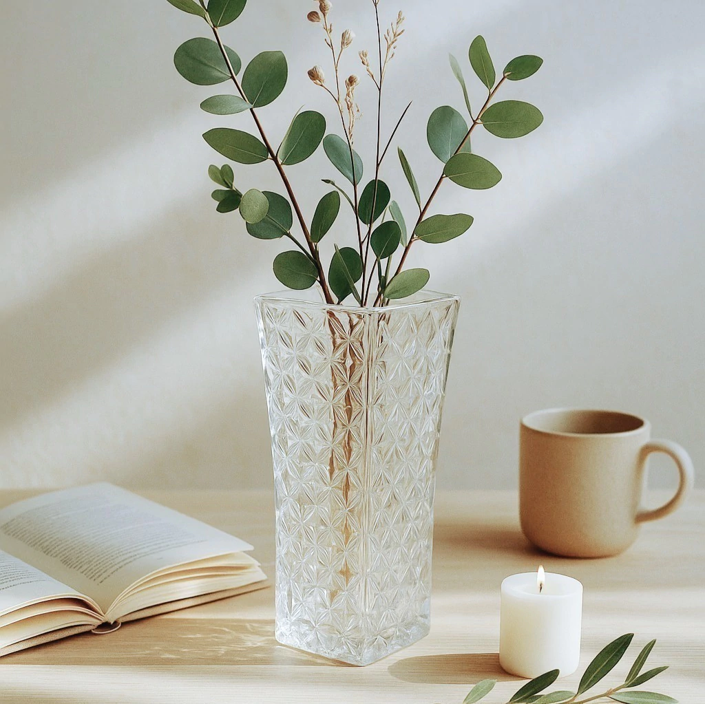 Descubrí el Florero Squares, una pieza que destaca por su textura de vidrio que parece cristal. Este jarrón de vidrio transparente es la opción ideal para realzar la belleza de tu hogar u oficina, dejando a tus invitados impresionados.