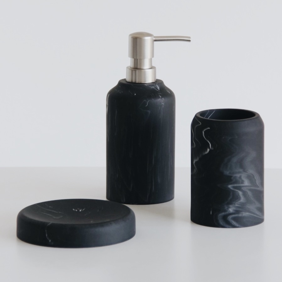 Set de baño de 3 piezas en resina consistente en un dispenser de jabon, un portacepillo y una jabonera