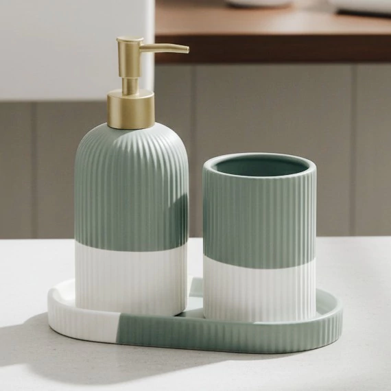 El set incluye tres piezas esenciales: - Dispenser de jabón líquido (19 cm alto x 8 cm diámetro), ideal para mantener tu jabón siempre a mano con un diseño ergonómico. - Portacepillo (11 cm alto x 8 cm diámetro), perfecto para organizar tus cepillos y mantener el orden en tu espacio. - Bandeja (20 cm largo x 10 cm ancho), que aporta una base elegante y funcional para completar el conjunto.